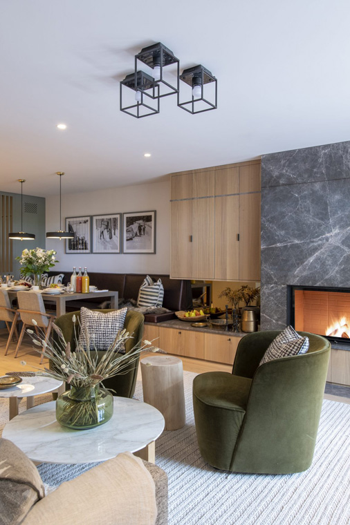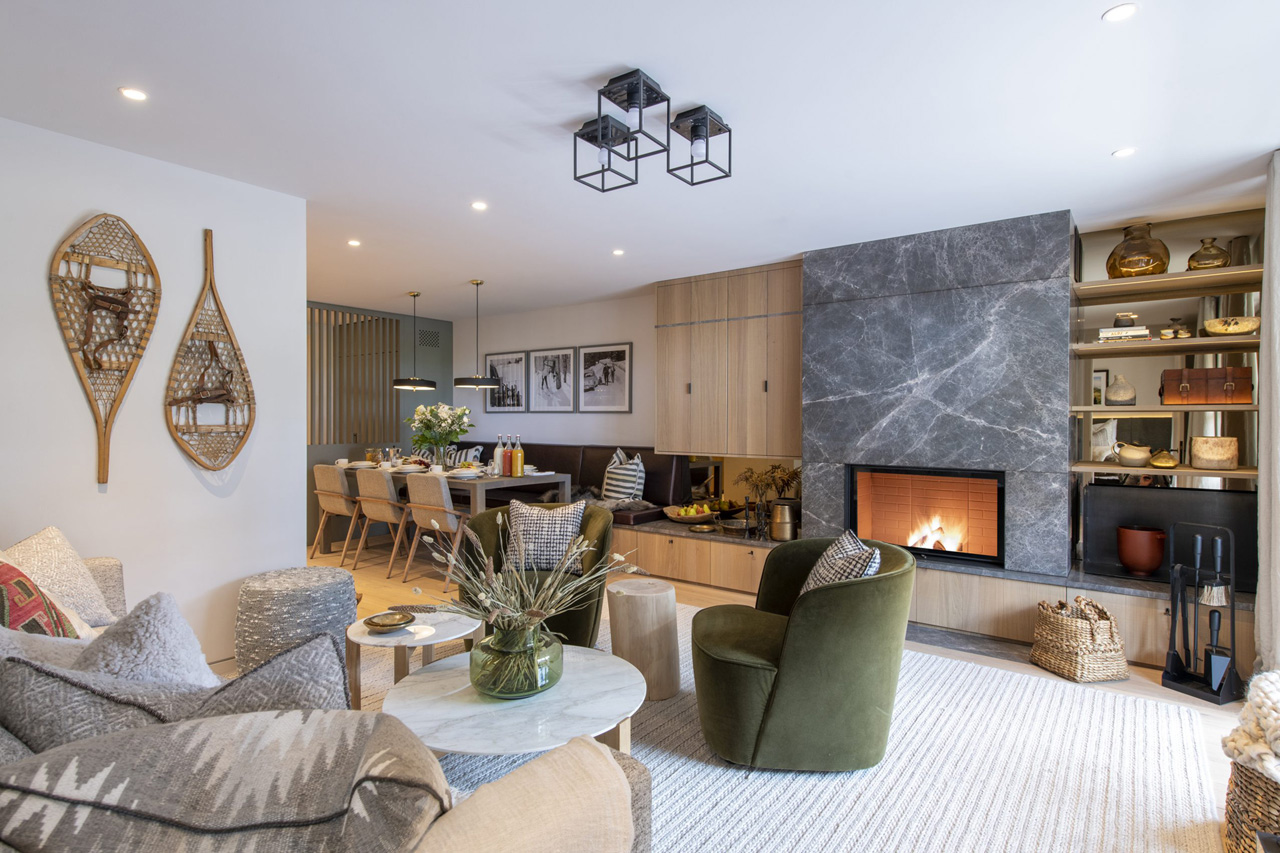 Set on the third floor of the residence, the apartment boasts a bright open-plan living and dining area with an open fireplace.