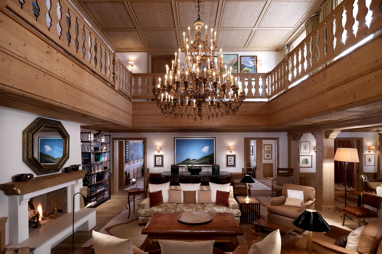 An extensive galleried living room with an open fireplace and a grand chandelier at its centre is filled with plush sofas, whilst the ceramic-oven warmed library provides the perfect place to unwind after a day on the slopes. The stylish dining room overlooks the piste and there is a small office and a well-equipped kitchen too.