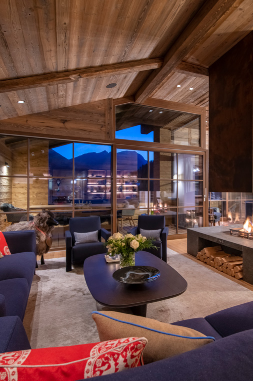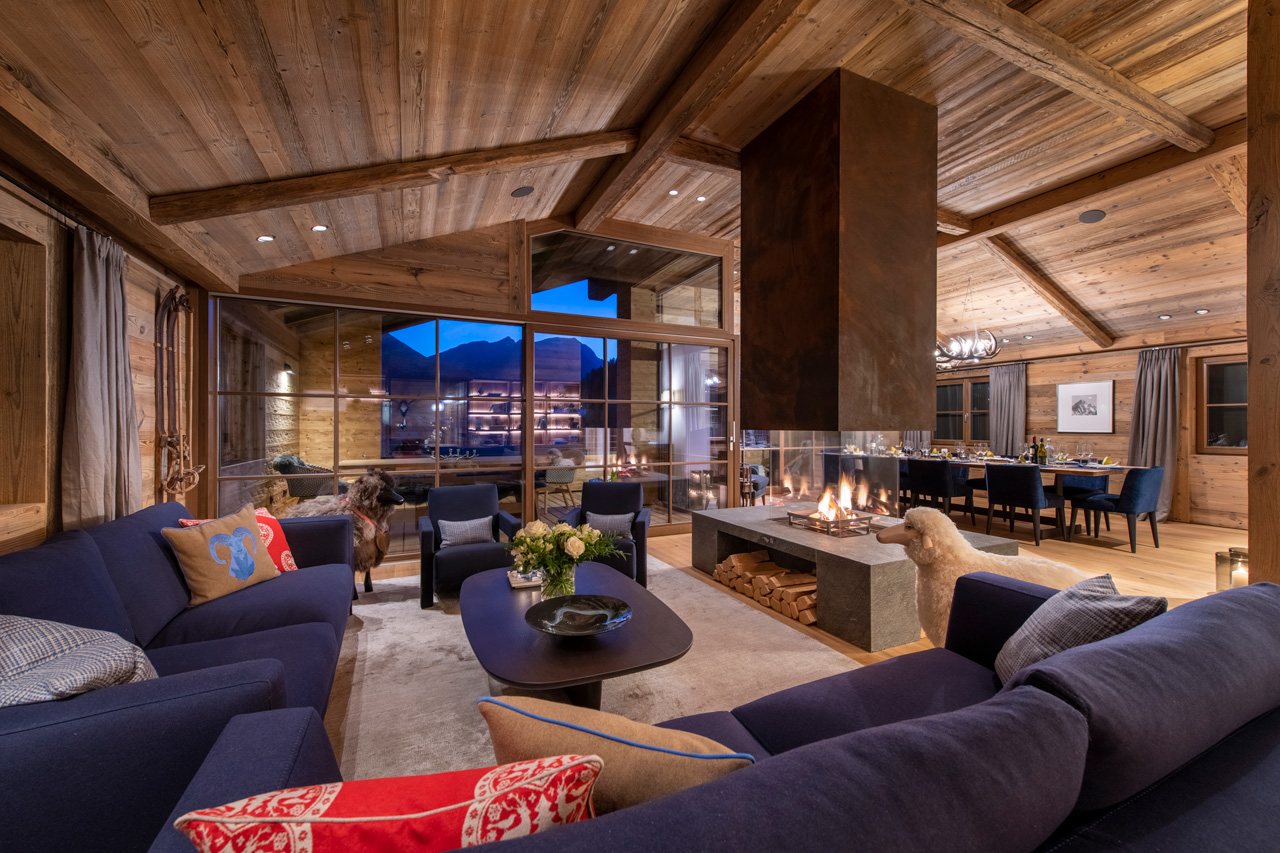 The entrance to the chalet is on the ground floor but the main living area is on the top floor. Here you will find an impressive open plan living and dining area with double-height ceilings and windows and an eye-catching contemporary fireplace at its centre. Sliding glass doors open onto a balcony with views of the snow-capped peaks.