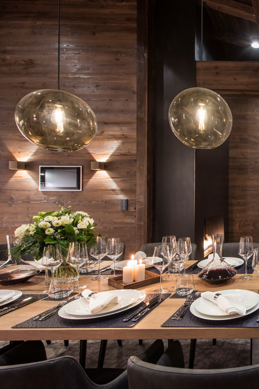 There is a large hallway with stylish seating area and ample storage for your winter clothes, and it leads to a spacious open plan living and dining area. On one side of the room are inviting sofas and a flat screen TV, and on the other an elegant dining area with seating for ten people. Double height ceilings, a decorative fireplace and subtle lighting all combine to create a sophisticated yet relaxed ambiance. French windows open onto a wonderful terrace with a magnificent view over the village below and mountains in the distance.