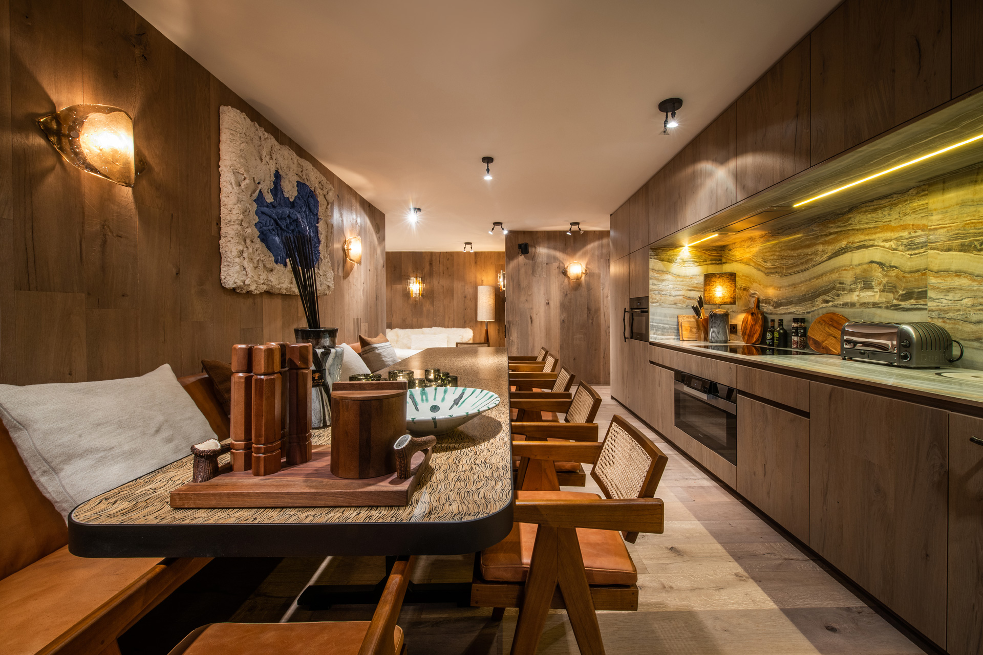 Located on the ground floor of the chalet, the apartment has an inviting living room featuring cosy sheepskins draped over the sofa. At the centre of the apartment is a contemporary electric fireplace to keep you warm on frosty winter nights and a modern flat-screen television with Netflix to keep you entertained.