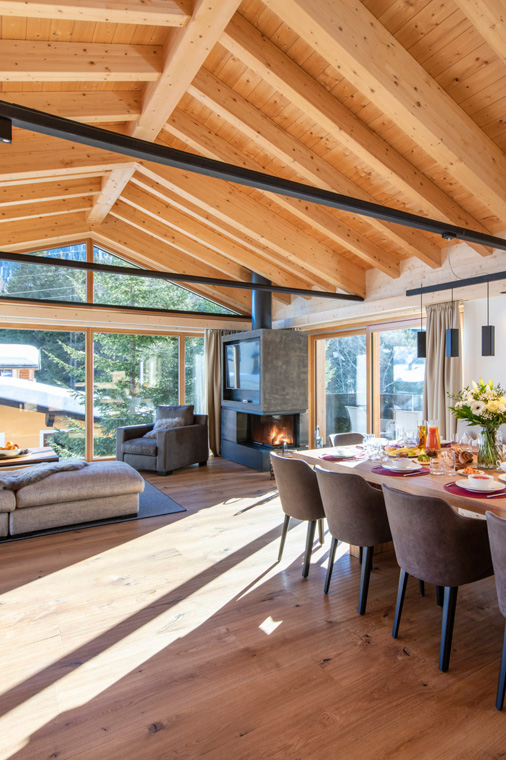 The chalet is both modern and elegant, with floor-to-ceiling windows bathing the interior in natural light. Set over three floors, the chalet offers 340m² of living space with an open-plan kitchen, dining and living room on the top floor. An open wood fireplace welcomes you home from the slopes and French windows lead onto a south-facing balcony with views of the resort.