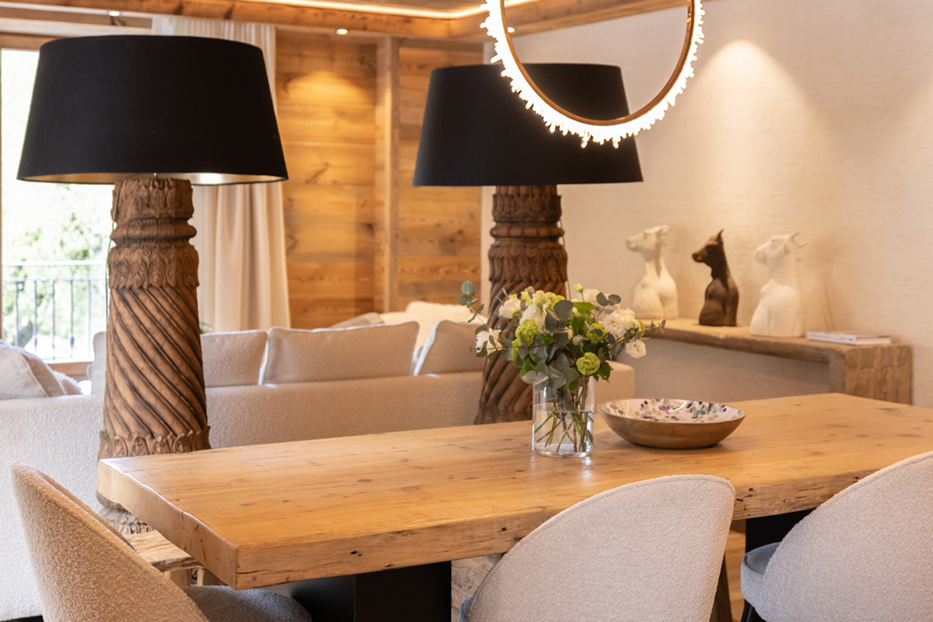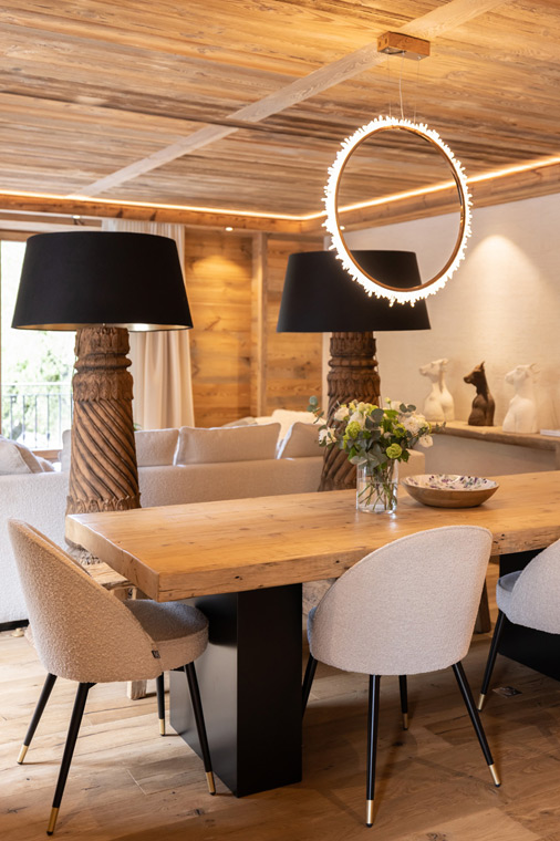 The main communal space comprises an open-plan living area with a comfortable sofa and armchairs to relax in. The living area opens out onto a sunny balcony overlooking Chamonix town where you can enjoy your morning coffee. An elegant dining table seats up to 10 guests and there's a modern kitchen too.