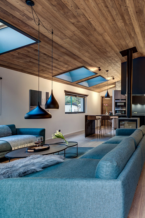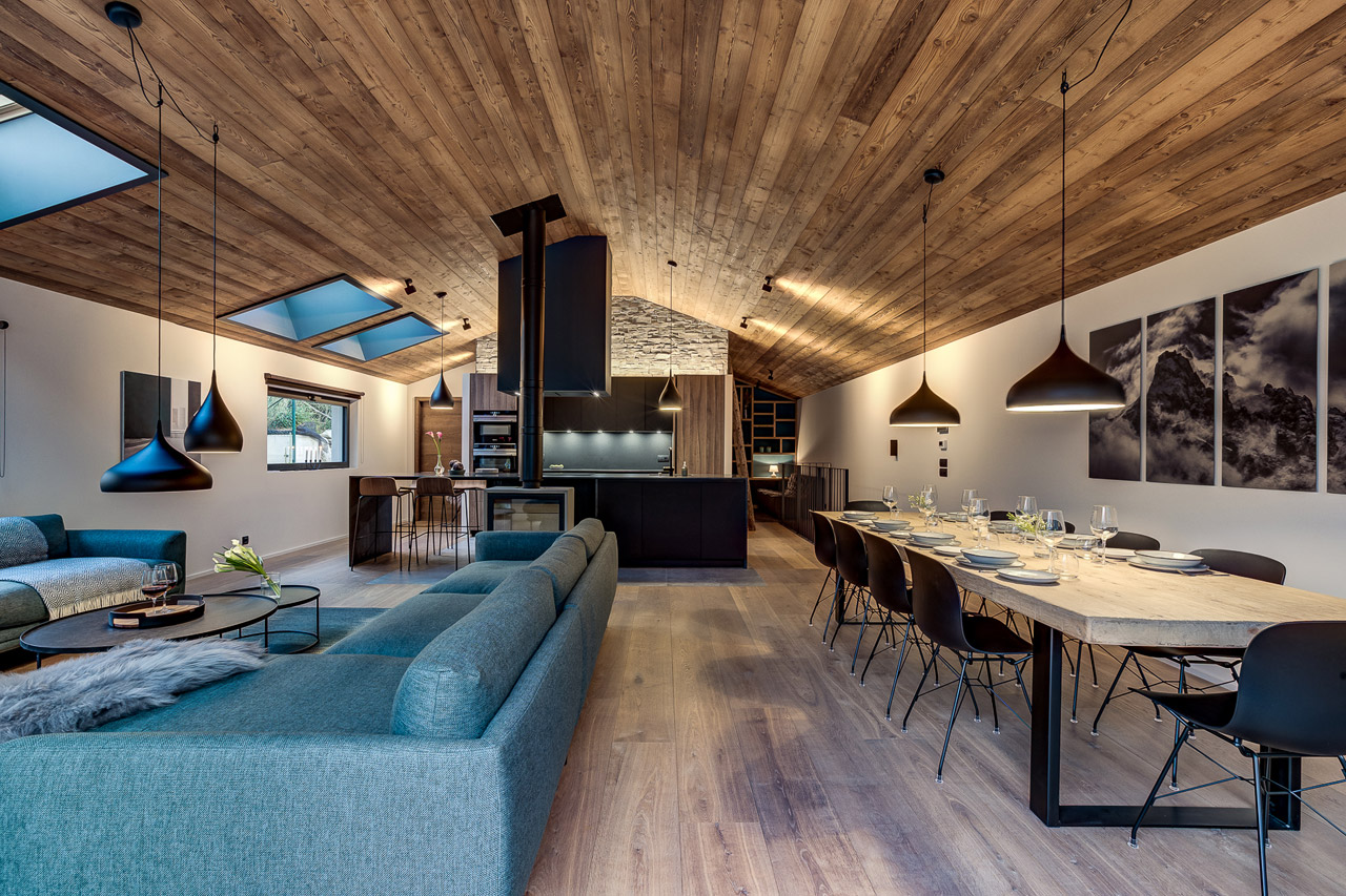 Set over two floors, this modern semi-detached chalet has a stunning open-plan living and dining area on the upper level. Doors open out onto a balcony with views of Mont Blanc.