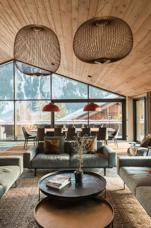 At the heart of the chalet is the incredible open-plan living area on the upper level. Full-height windows showcase the breathtaking Mont Blanc panorama and doors open out onto a beautiful furnished sun terrace and upper garden.