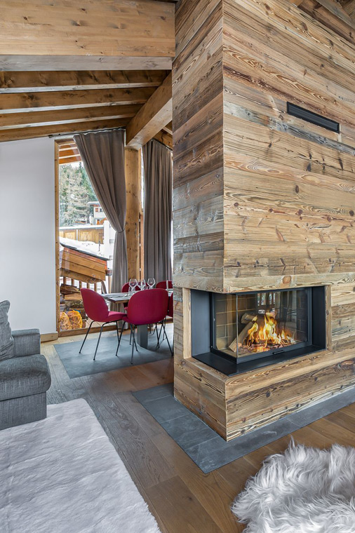 Fireplace and view from living area of Chalet Sisimiut in Courchevel 1550