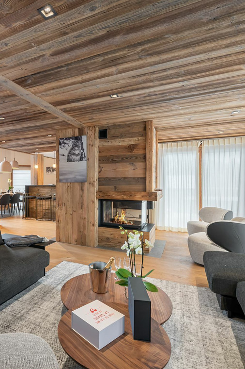 Hazelnut-toned wood combines with grey, cream and black furnishings to create a refined interior where you can relax on comfortable sofas or enjoy a drink at the bar. Floor-to-ceiling windows display the wonderful mountain views and doors open out onto a terrace. The fireplace divides the lounge area from the dining table and fitted kitchen.