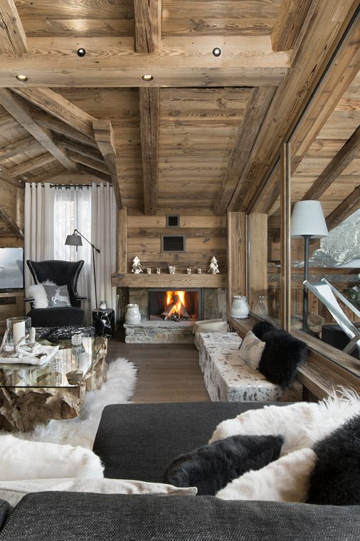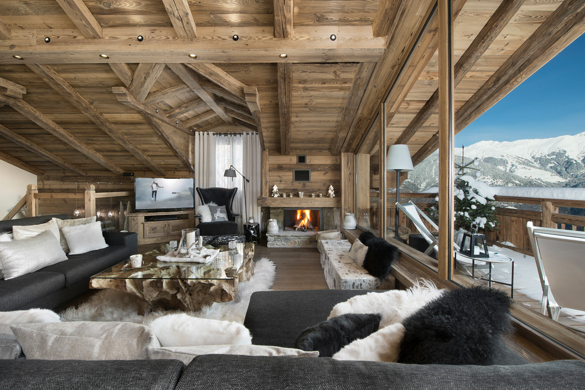 The main living area is light and spacious with floor-to-ceiling windows and glass doors providing unobstructed views of the Alps. An abundance of cushions and faux fur rugs dominate the living room and a wonderful log fireplace, along with inviting sofas, creates the perfect setting to relax in after a long day exploring the 3 Valleys.