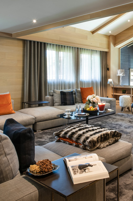A combination of luxurious fabrics in soft greys, accented with vibrant oranges, features throughout the interior, whilst doors open onto a balcony overlooking the slopes.