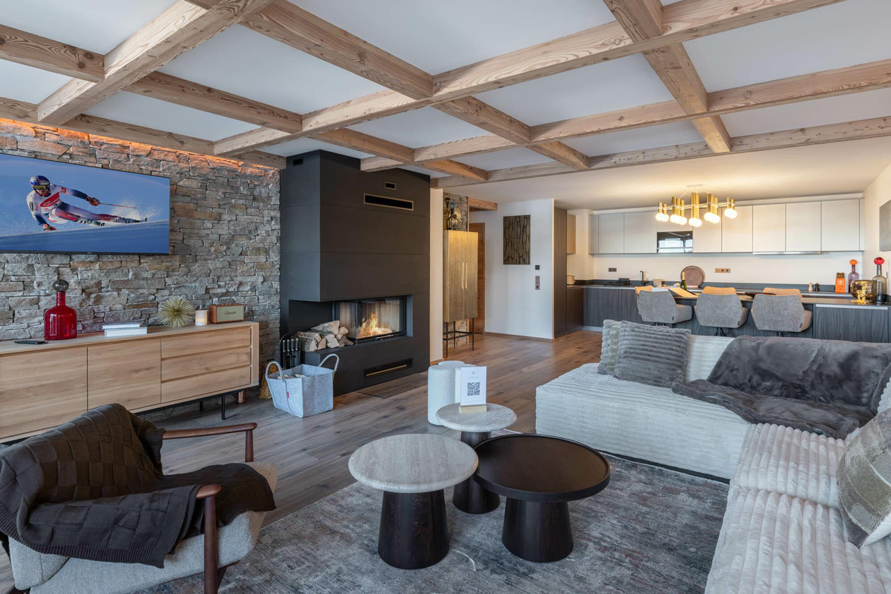 Unwind on the comfortable sofas, gather with your friends and family around the dining table and concoct delicious meals in the well-equipped kitchen. The space also features a fireplace and spacious balcony, perfect for savouring the fresh mountain air well into the evening.