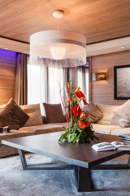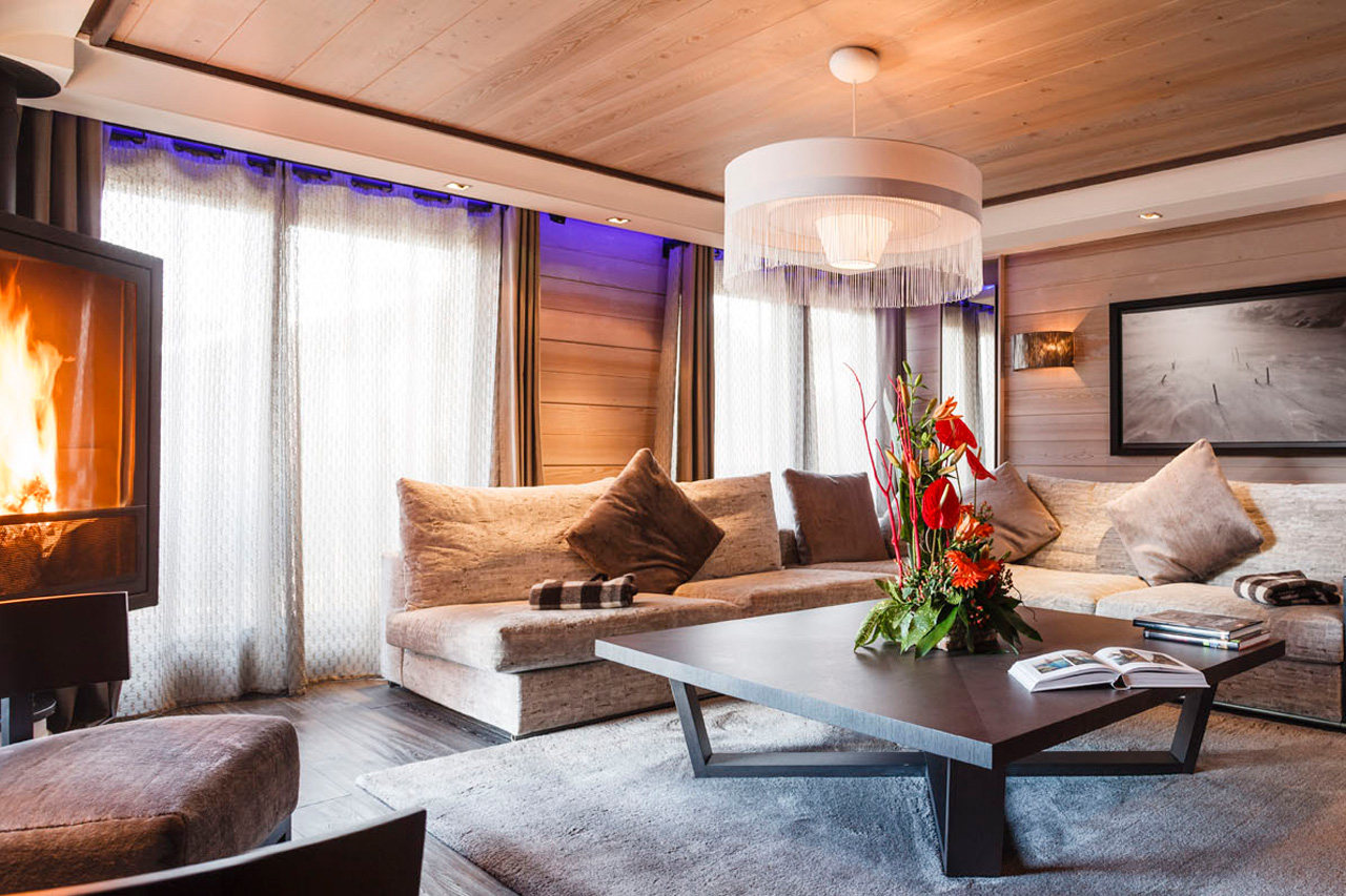 Located on the first floor of the Grandes Alpes Private Hotel, 142 m² Apartment Jade offers a spacious living room with a fireplace and views over Courchevel 1850.