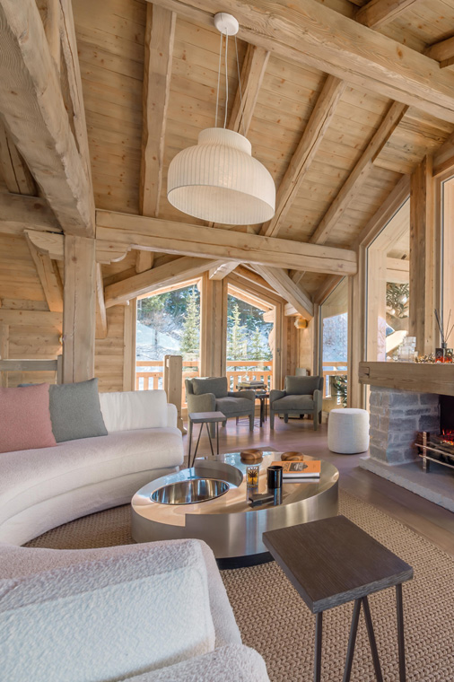 The top-floor living area—accessible by lift—opens onto a south-facing balcony with panoramic views of the Saulire summit, creating a bright, inviting setting for relaxation and entertaining.