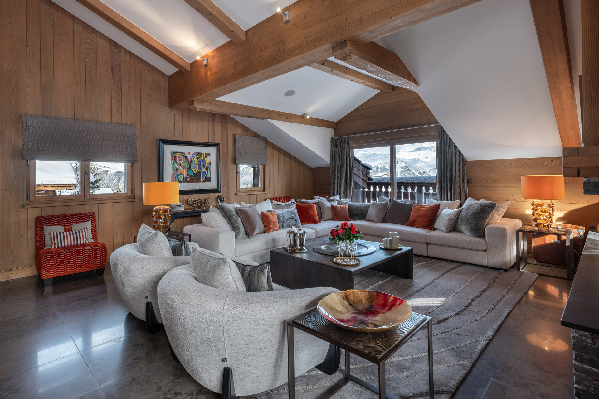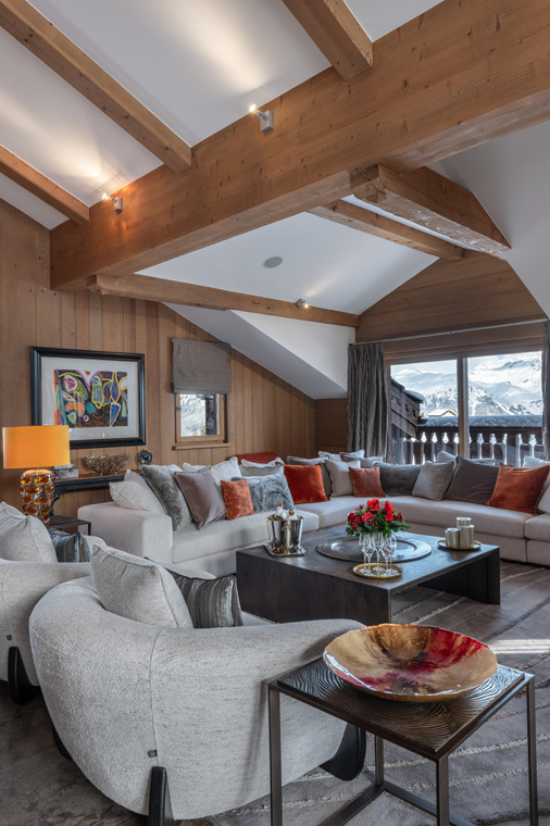 Timber used throughout the luxury chalet has been painstakingly coloured to achieve a warm Alpine ambiance suited to this unique mountain hideaway. A wrought-iron staircase, designed by a leading artisan atelier in Paris, provides a dramatic entrance into the main living room. The living space is open plan with a vaulted ceiling and stone-and-wood fireplace that separates two inviting seating areas opening onto a balcony. A large solid wood dining table is situated next to one of the sitting areas and alongside the big windows of the roomy living area.