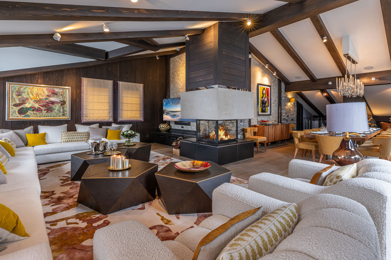 Chalet Le Coquelicot is a perfect blend of sophistication and comfort with bespoke materials and high-tech modern equipment. The top floor living room is a sumptuous open plan space with a formal seating area, vaulted ceiling, central fireplace and a grand dining table with an impressive glass chandelier above. A large terrace wraps around the living area providing outdoor seating and a great vantage point to take in the scenery.