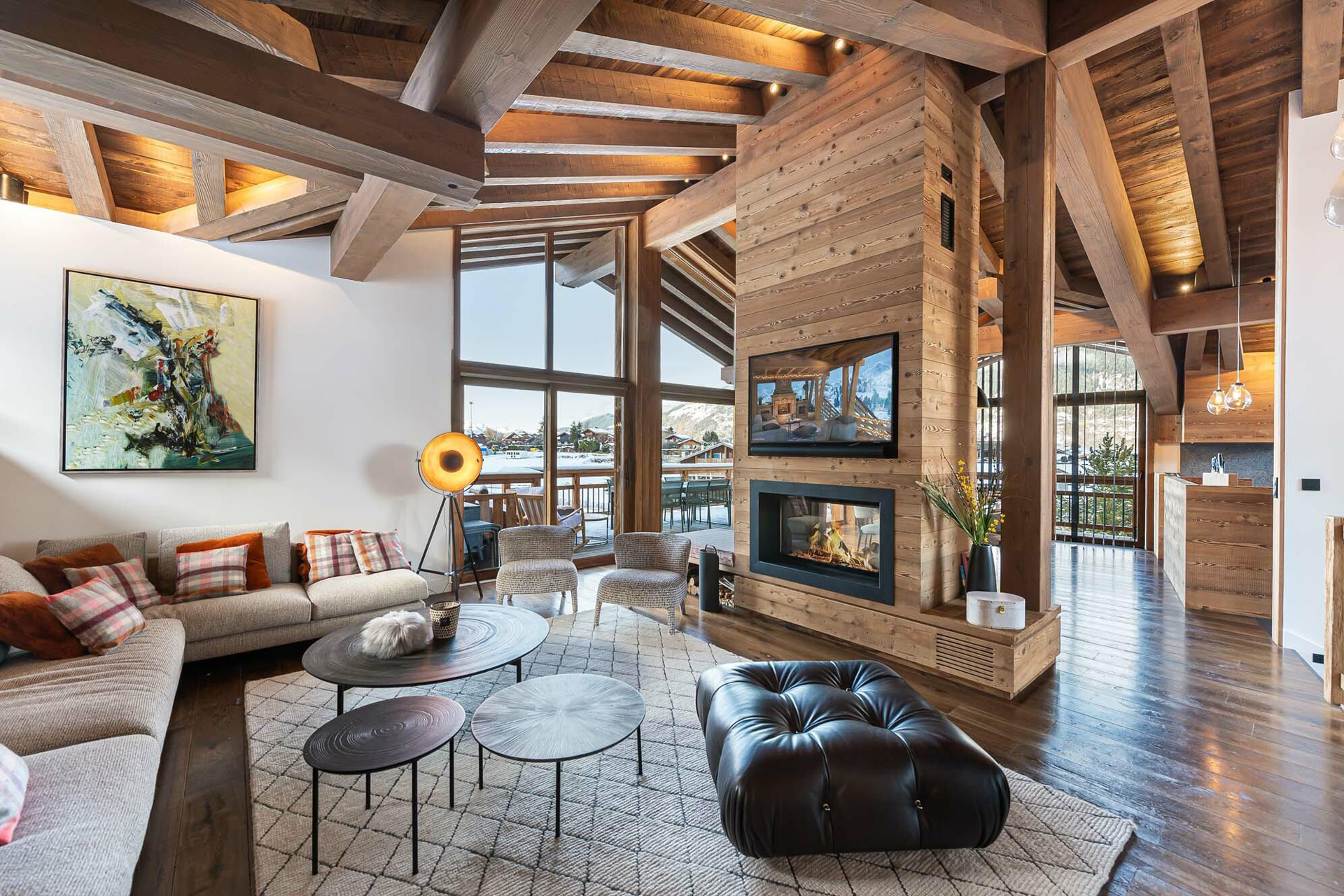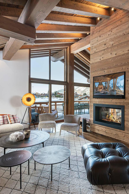 On the top floor of the chalet is a stunning open-plan living area with a comfortable lounge and bar area separated from the dining area and modern kitchen by a central fireplace.