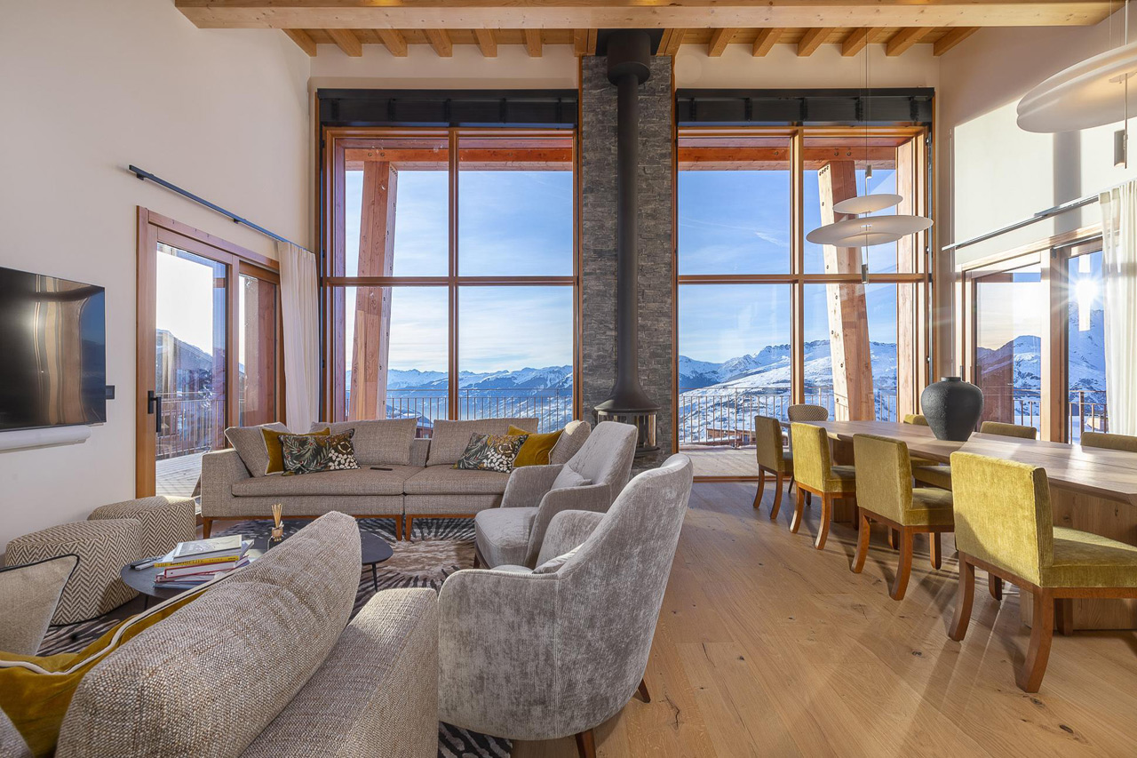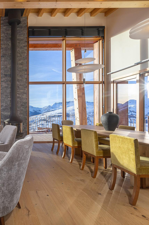 The open-plan living space is both elegant and modern, with the wooden furnishings giving it a traditional chalet feel. The huge floor-to-ceiling windows frame the breathtaking mountain views whilst flooding the room with natural light; letting you immerse yourself in the mountains well into the evening.
