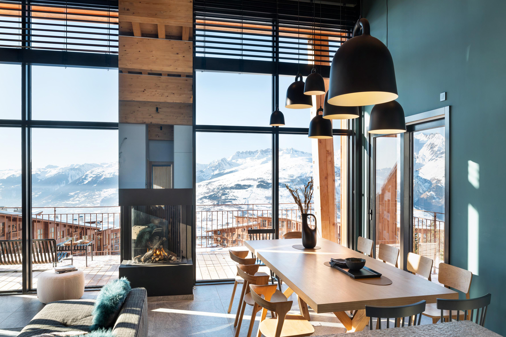 After storing your skis in the ski room, complete with boot warmers, take the stairs to the top floor open-plan living area. Encased by floor-to-ceiling windows, the living area is bright and spacious with extraordinary panoramic views of the surrounding peaks from the wrap-around terrace.