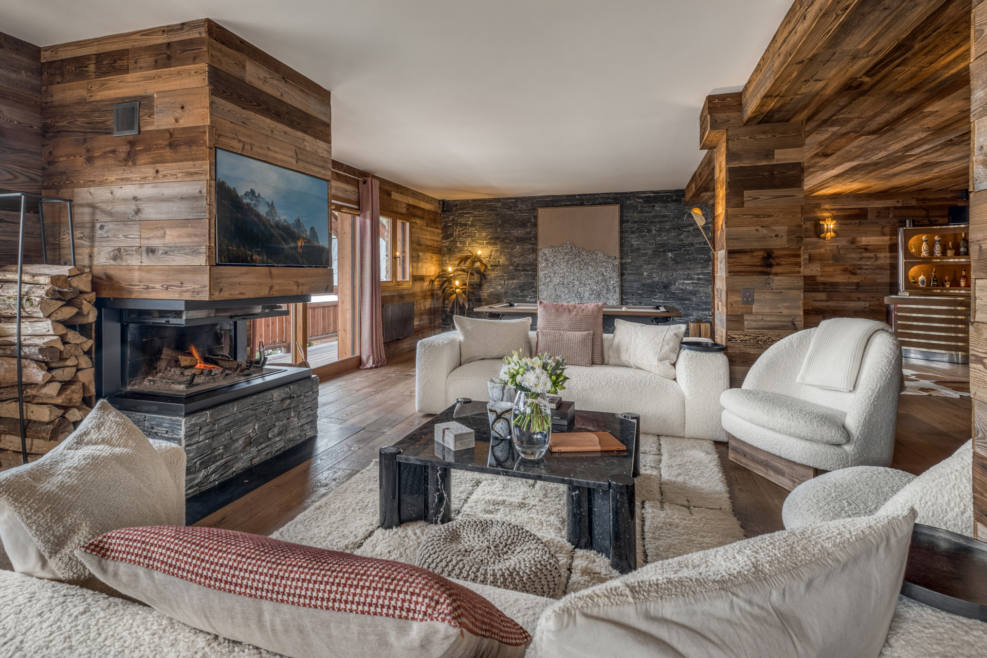 The chalet is set over three floors with the main entrance on the ground floor. From the entrance, you are led into a chic living room with a central fireplace, comfy sofas and armchairs to relax on and a TV.