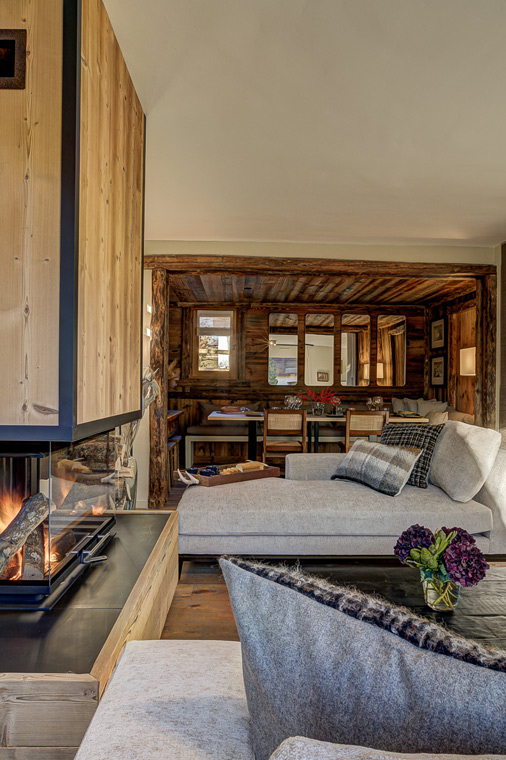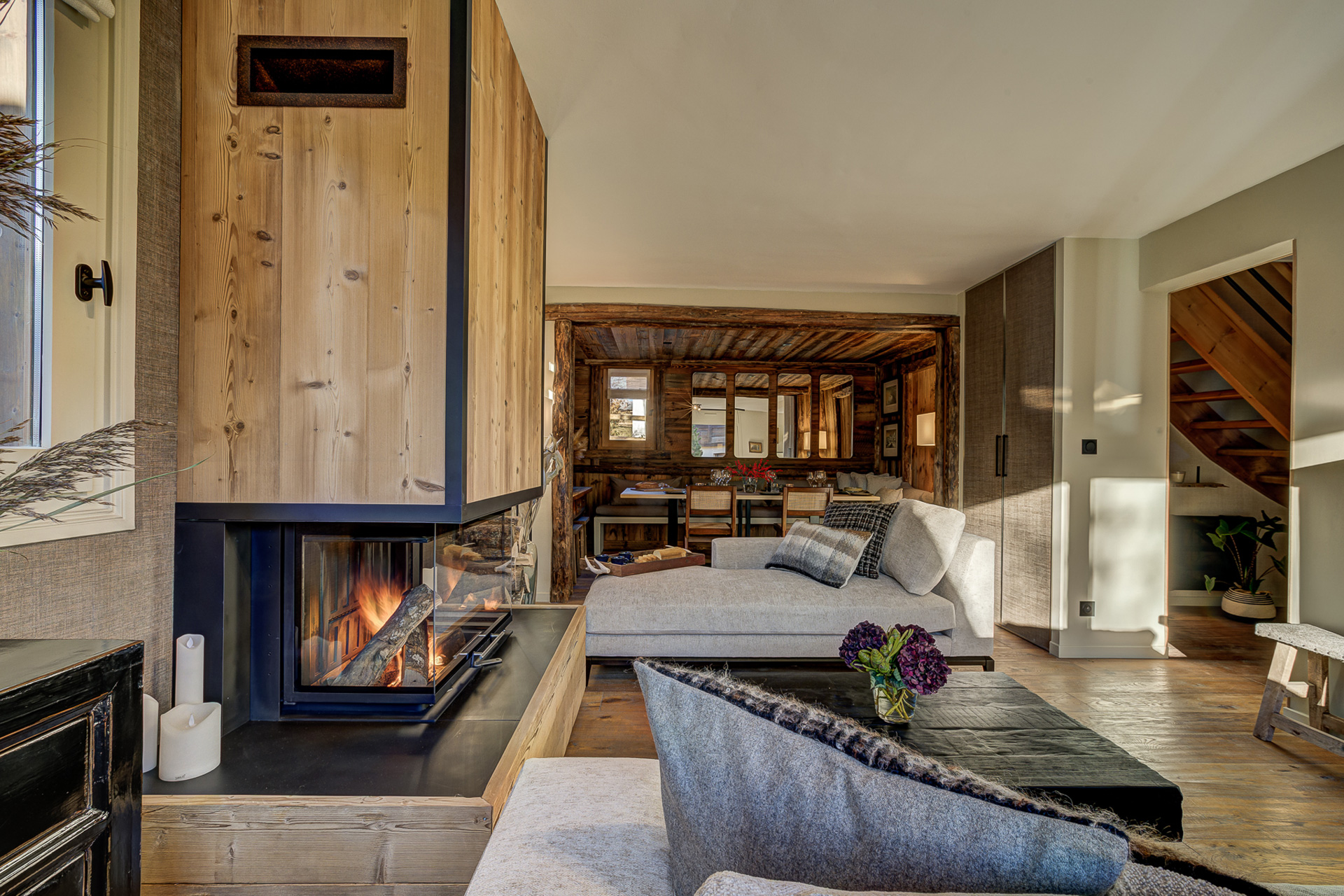 A beautifully designed fireplace and comfortable sofa area provide the perfect spot to unwind after a day on the slopes. The elegant dining space seats up to ten guests, and the fully equipped kitchen ensures a seamless cooking experience. Large doors open onto the garden and a sun terrace, complete with a firepit, where you can soak up the breathtaking views.