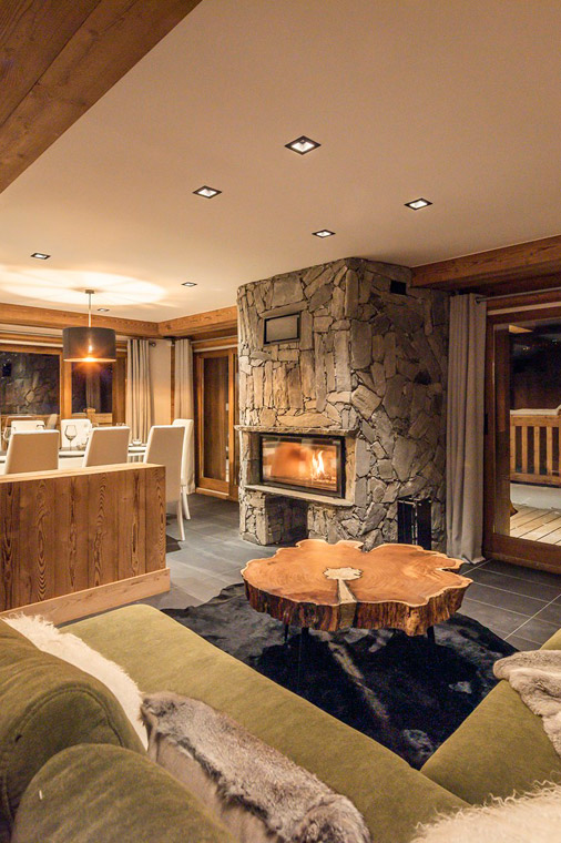 Fireplace in living area of Chalet Alya in Meribel