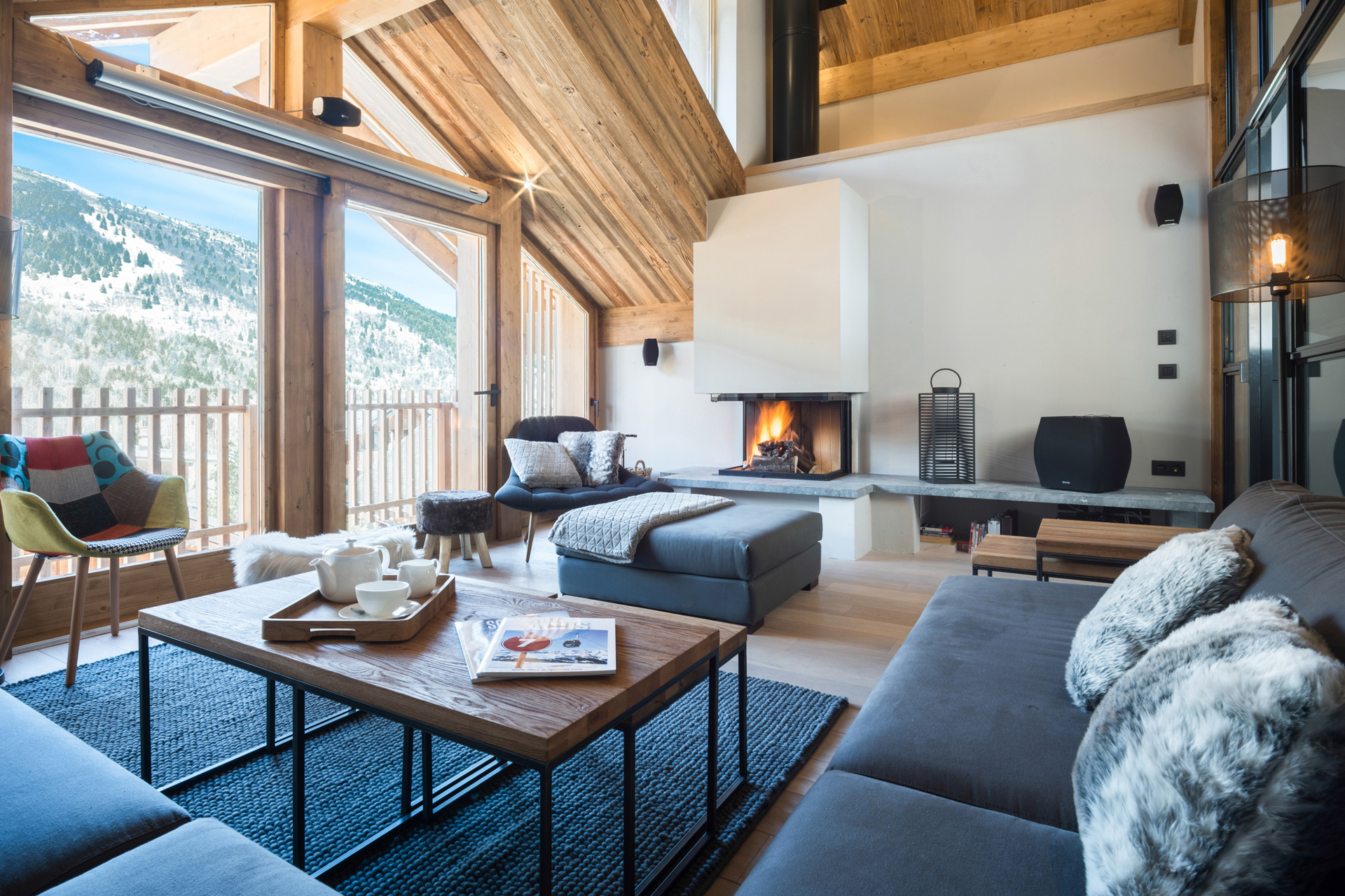 The living area is located on the top floor of the property, featuring plush, L-shaped sofas arranged around a cosy fireplace and a cinema projector screen—perfect for movie nights. Chalet Caro also offers a ski room, a landscaped garden and two parking spaces.