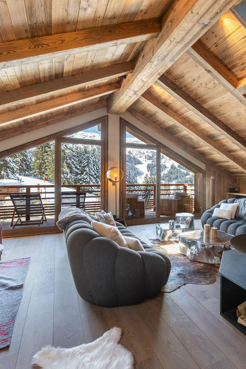 Set over four floors, linked by an elevator and staircase, the chalet has plenty of space to spread out. The open-plan living area with sofas set around a fireplace is a welcome sight after a day on the slopes.