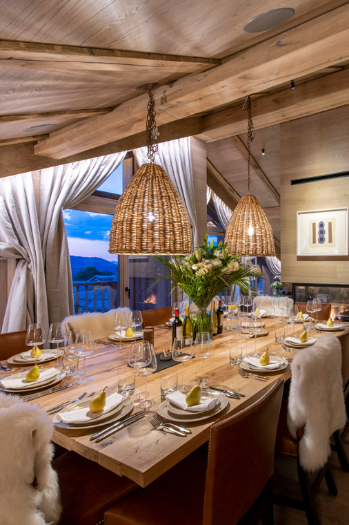 The entrance to the chalet is on the ground floor, along with a spacious ski room with boot warmers. The main living area is located on the top floor of the chalet. Here you will find an open plan living and dining area with a central fireplace. The dining table seats 12 people but can be separated into two to seat up to 16. Double doors lead onto a balcony with views across the valley.