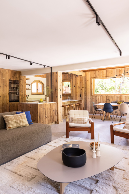 At the heart of the chalet is a light-filled open-plan living and dining area, where floor-to-ceiling windows frame the alpine surroundings. A kitchen with a marble island opens onto a dining area that seats eight, while a central fireplace brings a warm and inviting ambience to the lounge.