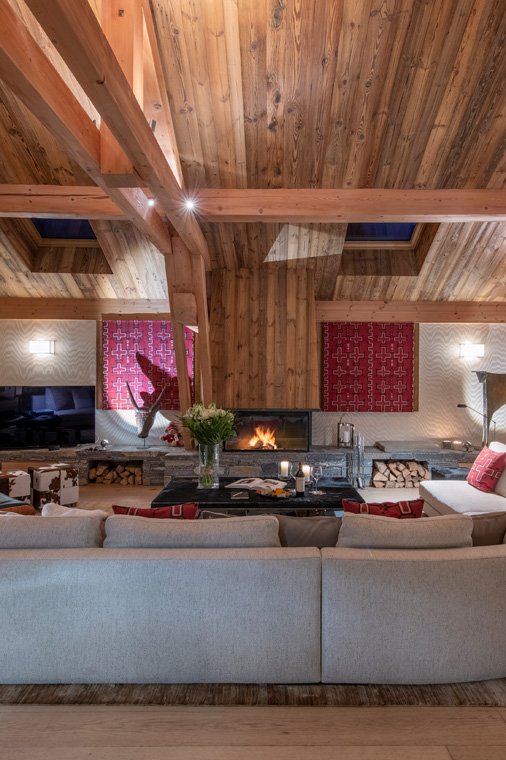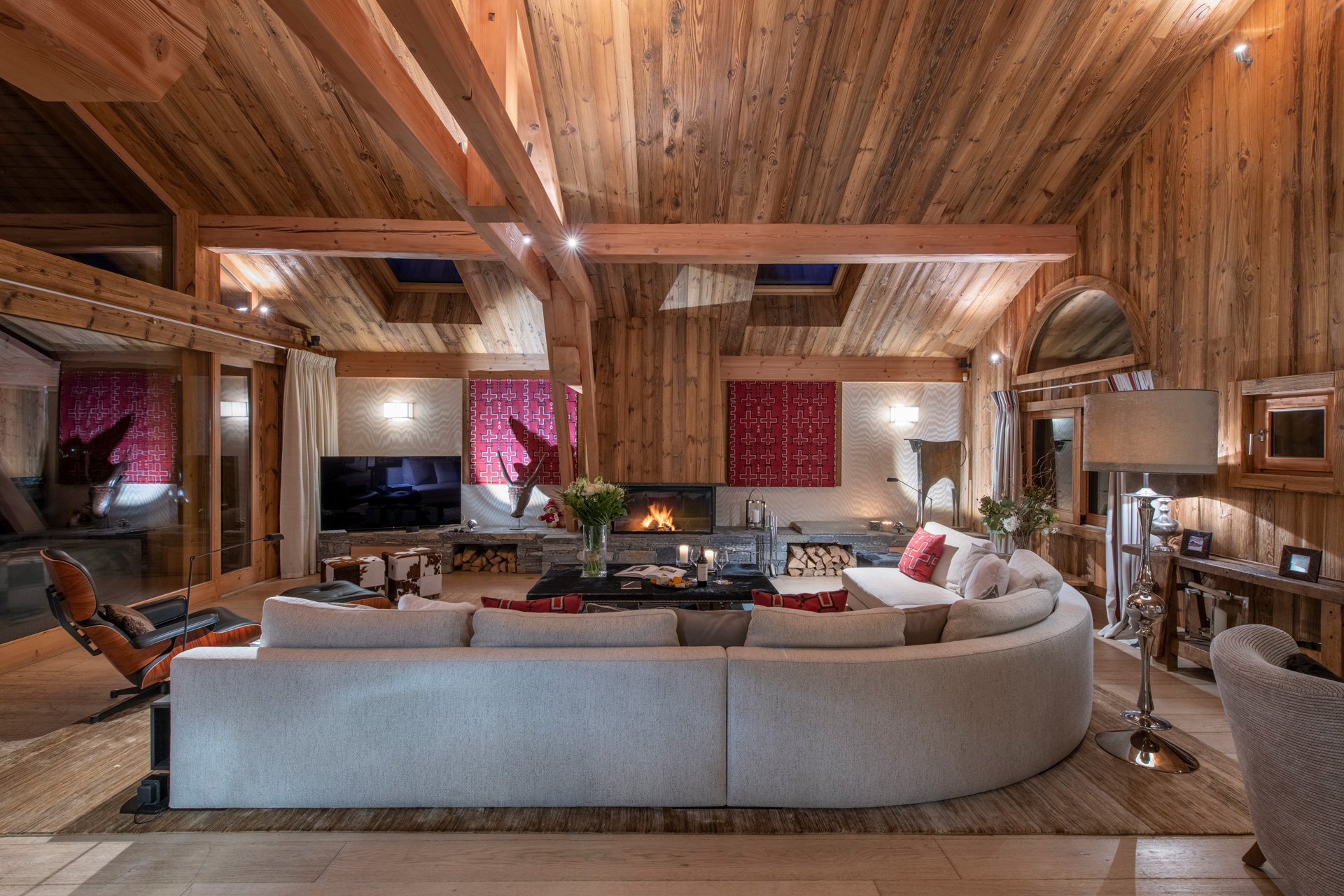 The chalet’s interior blends alpine charm with sophisticated neutral tones and features state-of-the-art technology.