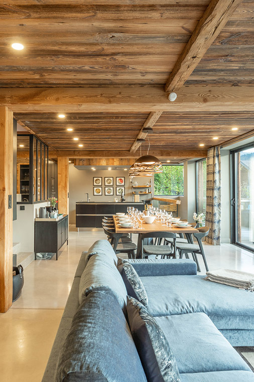 The heart of the chalet lies on the first floor, where a spacious open-plan living area welcomes guests with floor-to-ceiling windows, a glass-fronted fireplace, and comfortable sofas arranged around a cosy TV nook. A large dining table is perfectly positioned to take in the mountain views, while the modern kitchen, with its central island, offers everything needed for convivial evenings together.