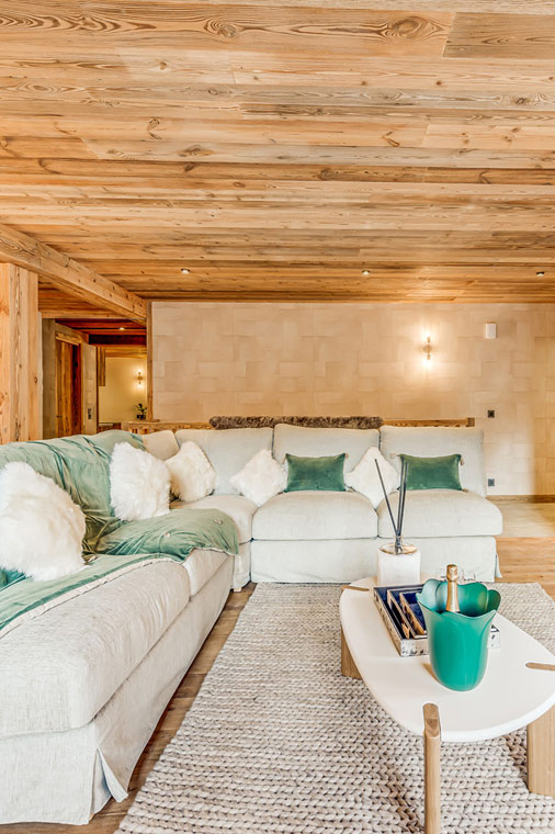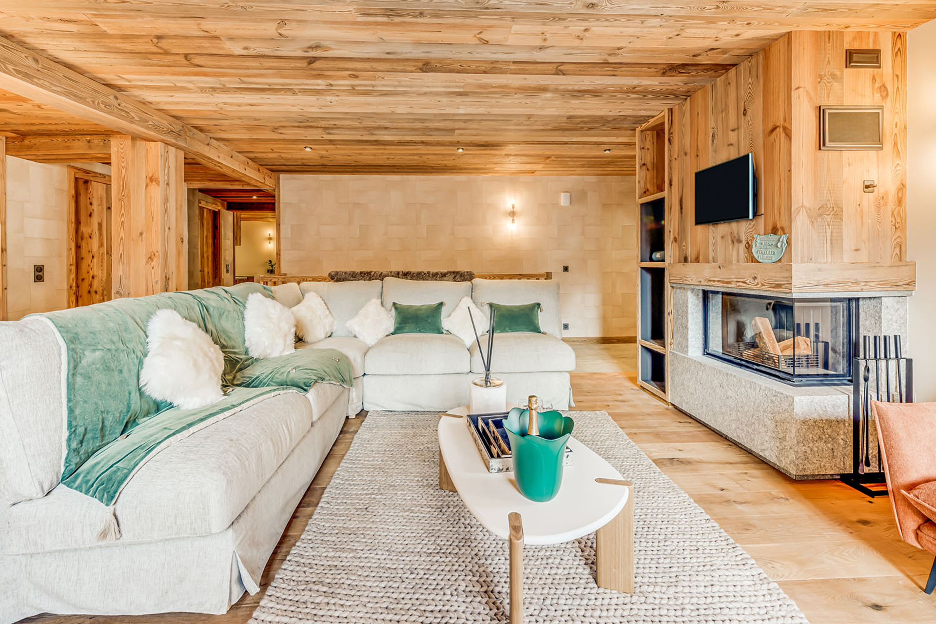 The entire second floor is dedicated to an open-plan living area, complete with balcony access. Traditional Alpine materials seamlessly blend with modern design, creating a bright and inviting space. A large wrap-around sofa sits in front of a cosy fireplace, flowing effortlessly into the dining area and fully-equipped kitchen.