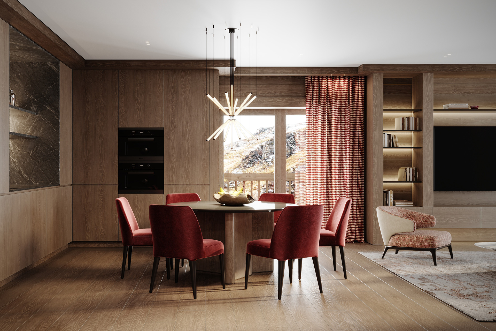 The open-plan living area features a comfortable sofa set facing a large TV, a stylish dining space and a well-equipped kitchen. This inviting area opens onto a sunlit balcony with mountain views.