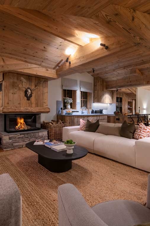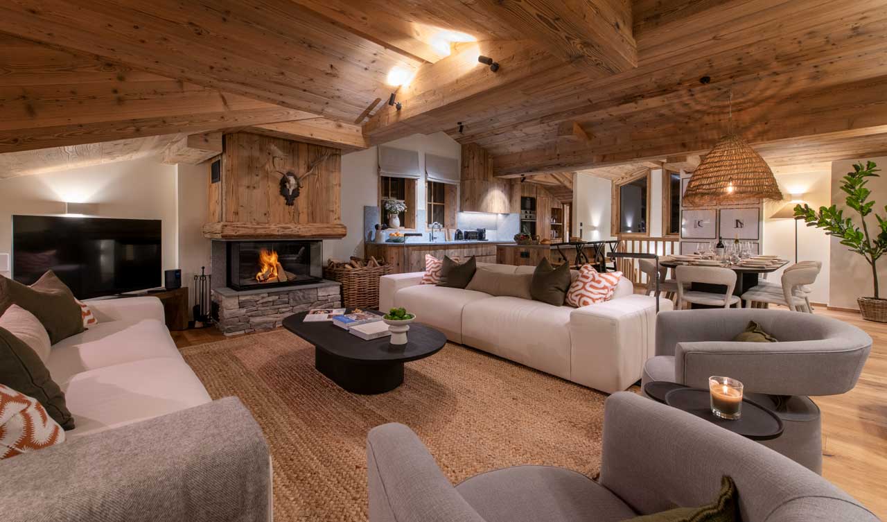 The penthouse spans the top two floors of an exclusive chalet, seamlessly blending modern elegance with the warm charm of traditional design.