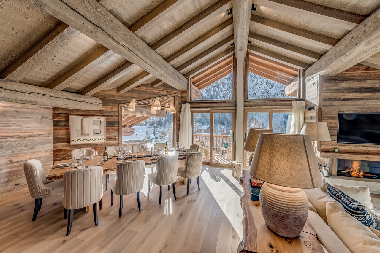 Stairs lead up to the main living space on the top floor of the chalet. Here you will be greeted by an open-plan living and kitchen area. You can relax at the kitchen island, drink in hand, as the chef is at work.