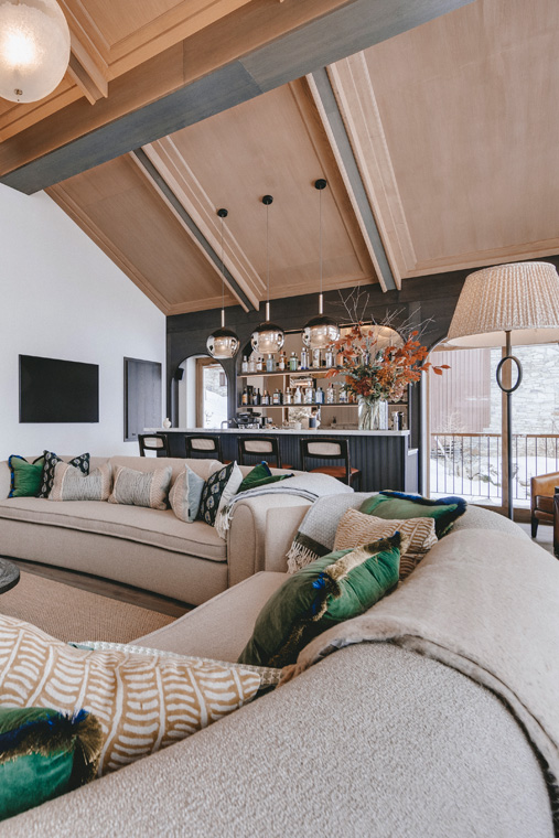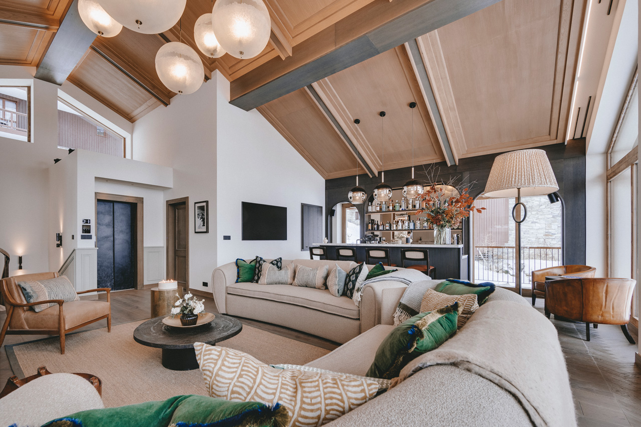 The main living area is on the top floor of the chalet. With glass walls, there is plenty of natural light and the challenging La Face piste, illuminated at night, can be viewed from here too.