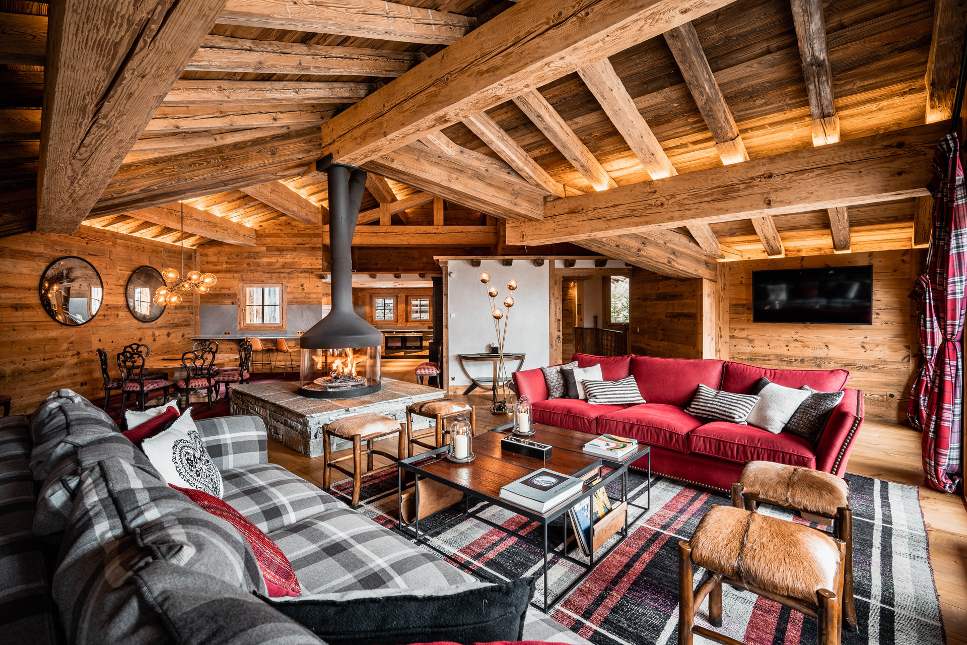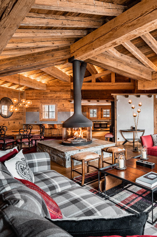 A circular dining table for 11 sits beside an open-plan, fully equipped kitchen, all leading to a wide balcony with breathtaking views of the French Alps. The chalet also offers high-speed internet and Apple TV.