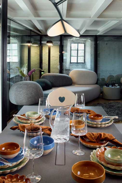 The living area is thoughtfully designed, featuring plush sofas arranged around a designer fireplace and a large-screen TV. This space is perfect for gathering together, whether curling up by the fire or enjoying a gourmet meal at the modern dining table. The room includes a concealed kitchen and opens directly onto the property’s outdoor area, inviting you to take in the surrounding natural beauty.