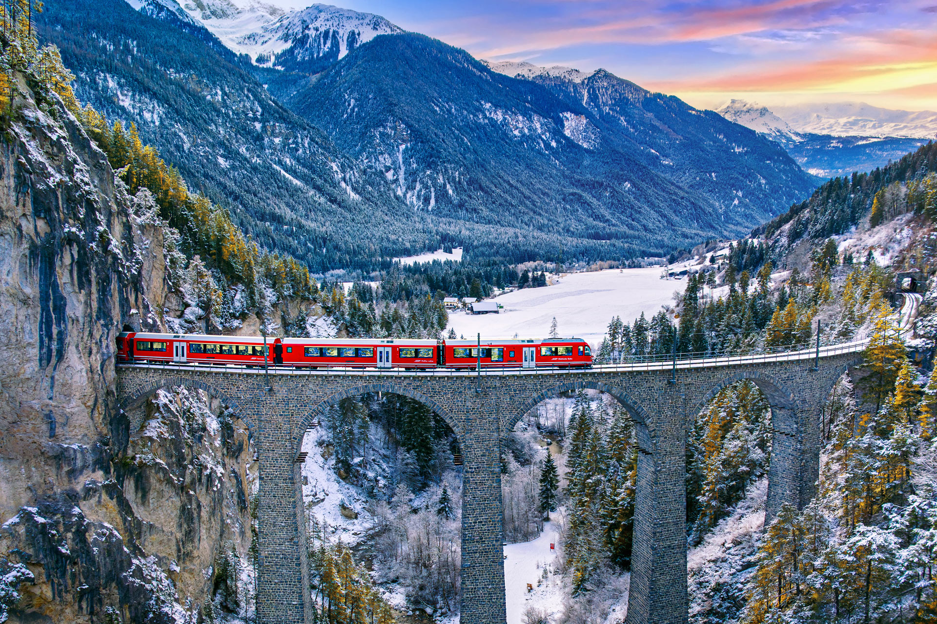 Bid farewell to St. Moritz and board the iconic Glacier Express, often referred to as the ‘slowest express train in the world.’ This scenic journey takes you through Switzerland’s heartland, crossing 291 bridges and passing through 91 tunnels. Gaze out at dramatic gorges, snow-blanketed forests, and picture-perfect villages as you sip champagne in the comfort of your first-class seat.