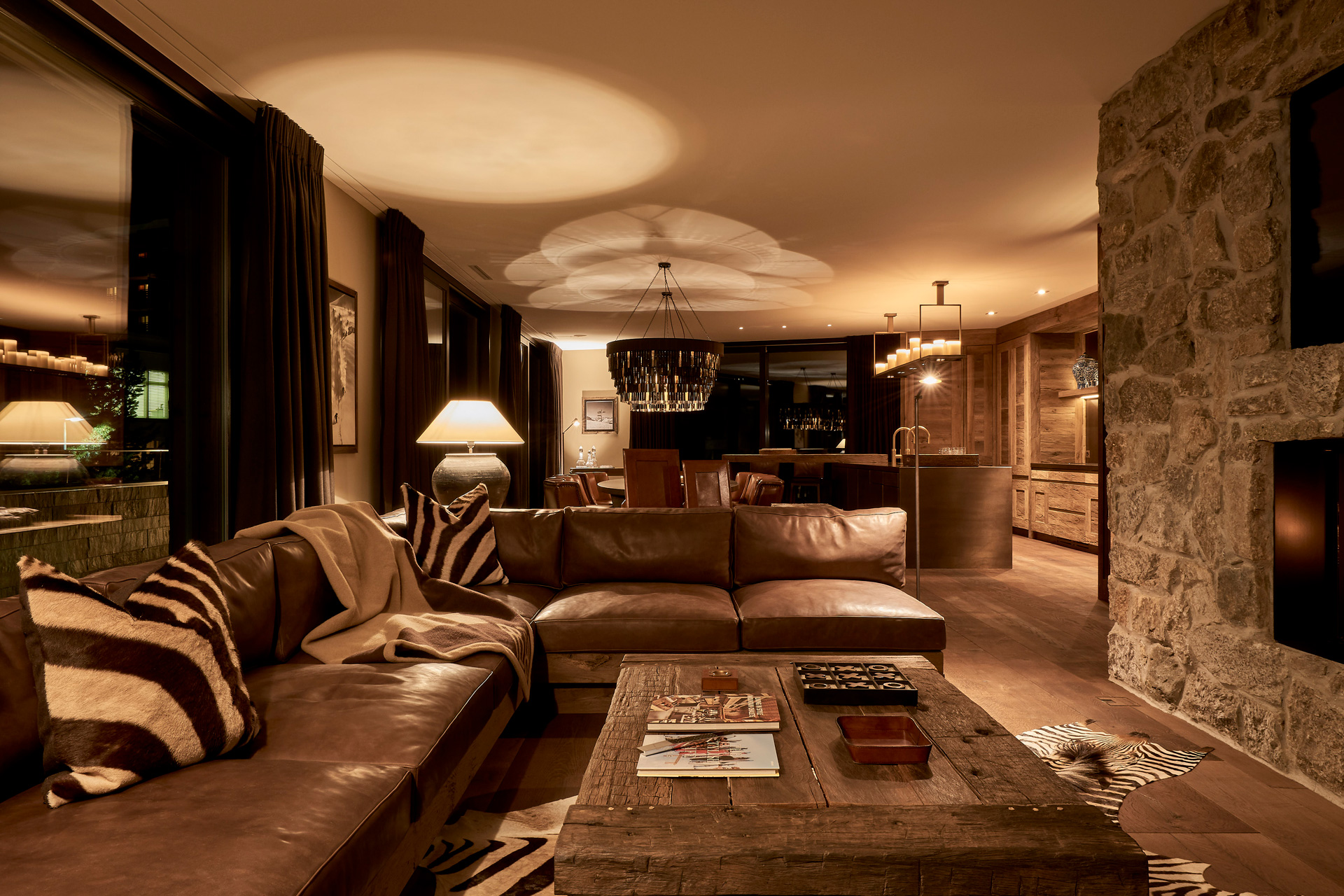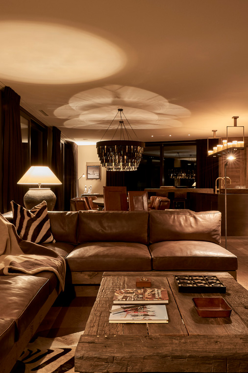 The style of the penthouse apartment combines traditional alpine elements with a more modern style of mountain architecture.