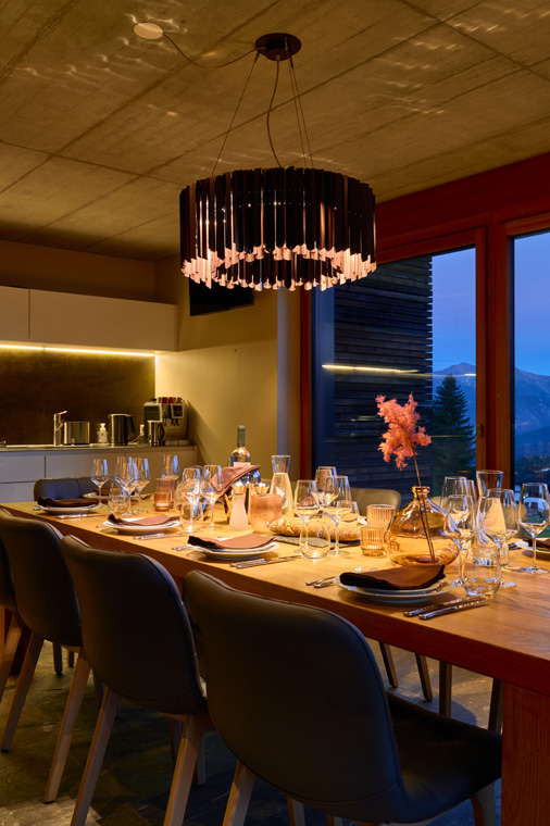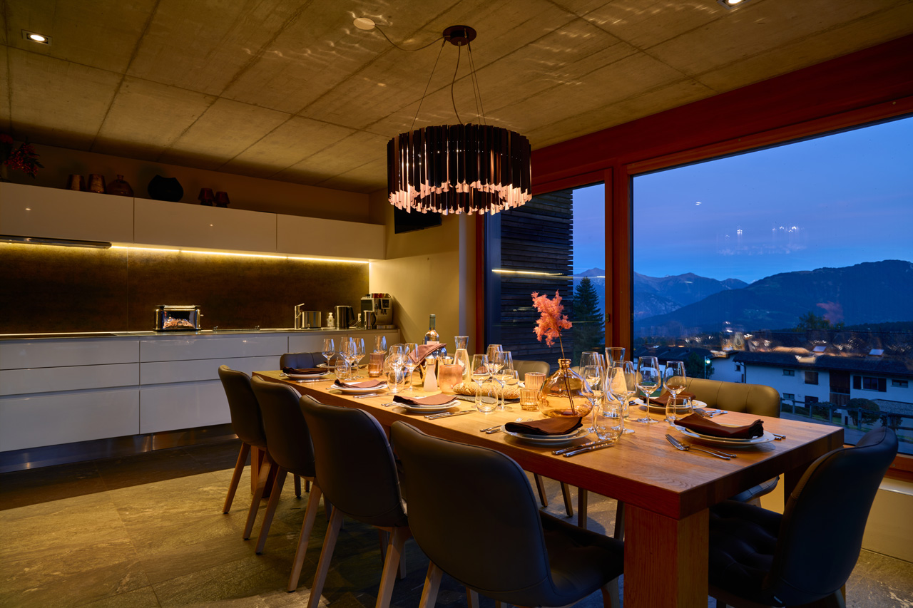 Comfortable sofas surround a crackling fireplace and there's a modern kitchen and dining area, perfect for fondue or raclette nights. Doors open onto a terrace where you can enjoy a spot of al fresco dining.