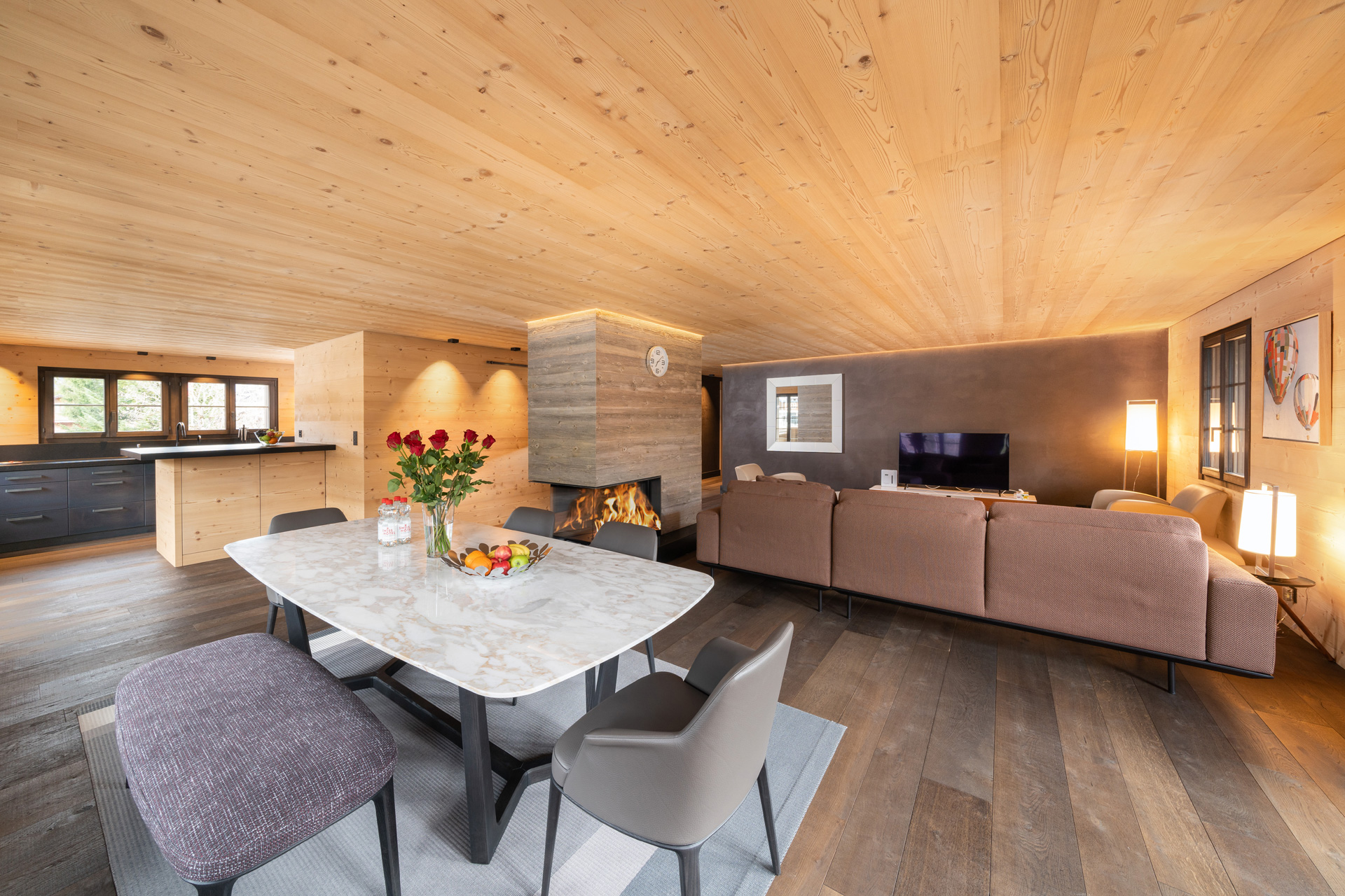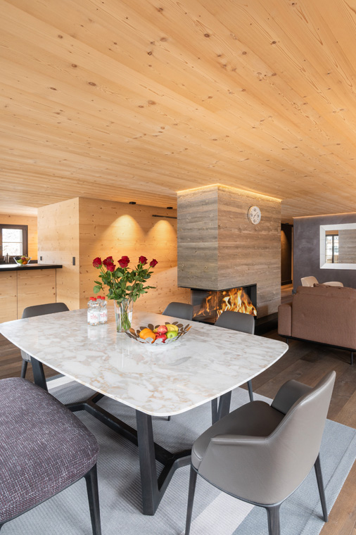 Cook together in the modern fully-equipped kitchen, gather at the elegant dining table, relax by the fireplace, and admire the breathtaking mountain views from the balcony.