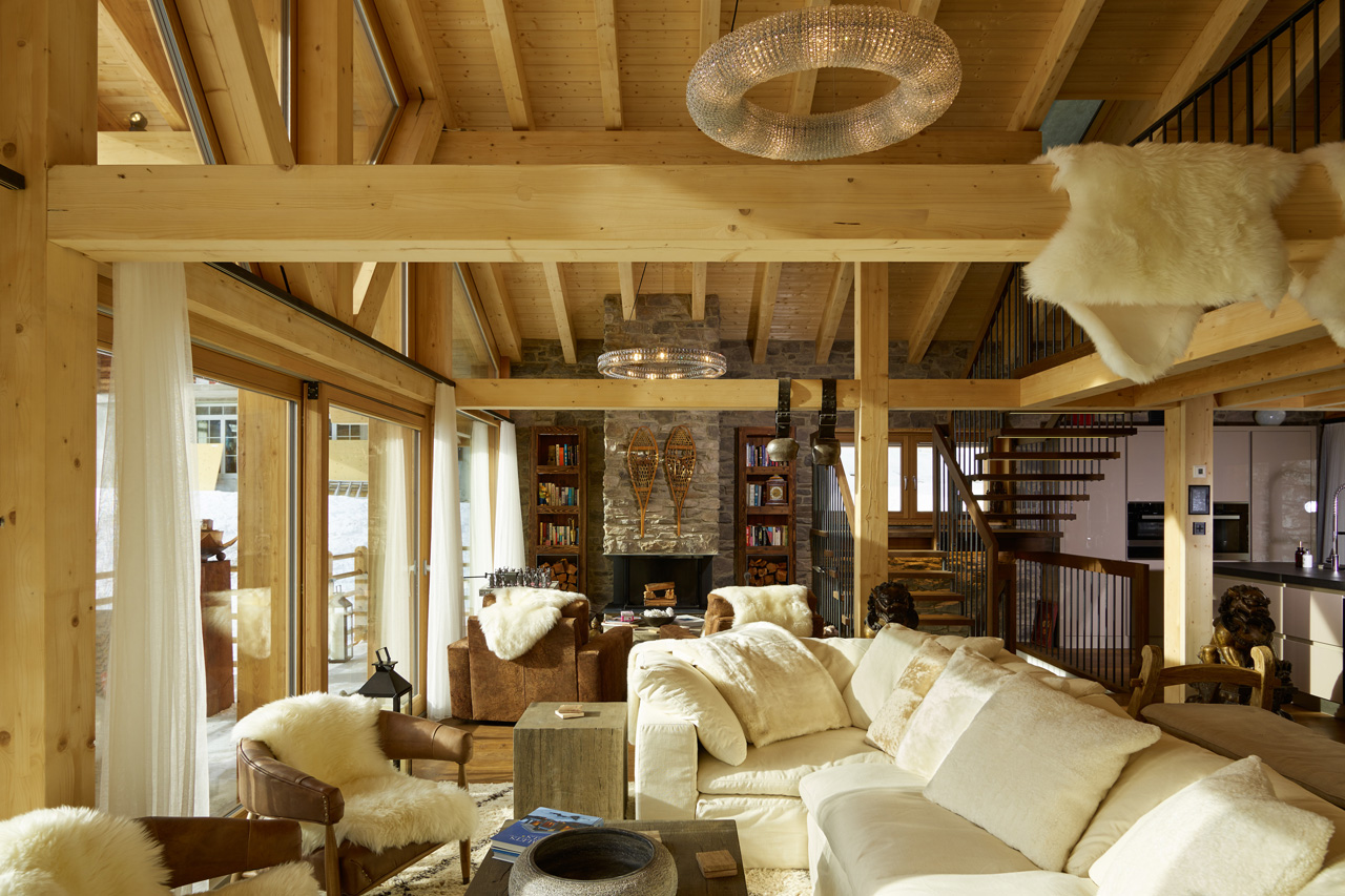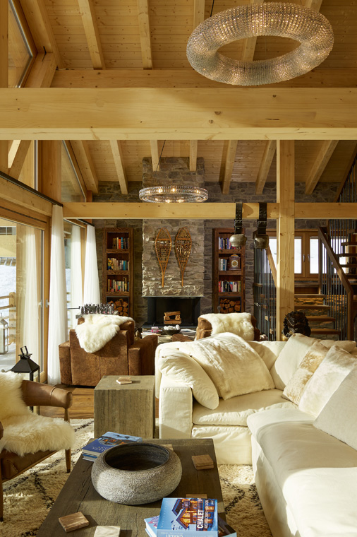 The main living area with high ceilings and large windows is situated on the top floor of the chalet. Here you will find an inviting seating area with fur-lined armchairs and comfy sofas and a dining table set near the fireplace.
