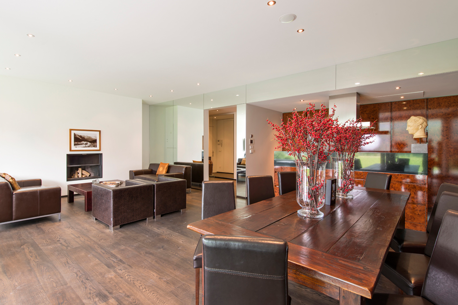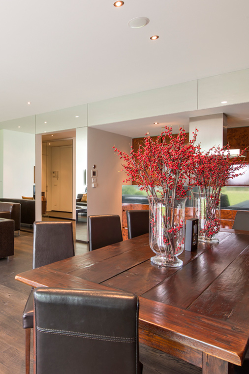 Apartment Snow Garden has an extremely exclusive location right next to the renowned Badrutt’s Palace Hotel in St. Moritz. The interior of the apartment has a sophisticated Asian vibe and includes an open-plan living and dining area.