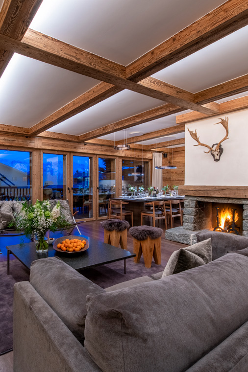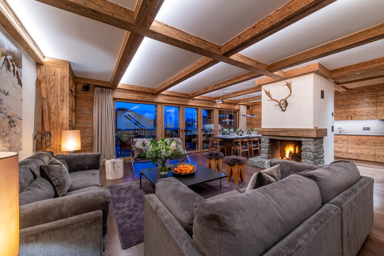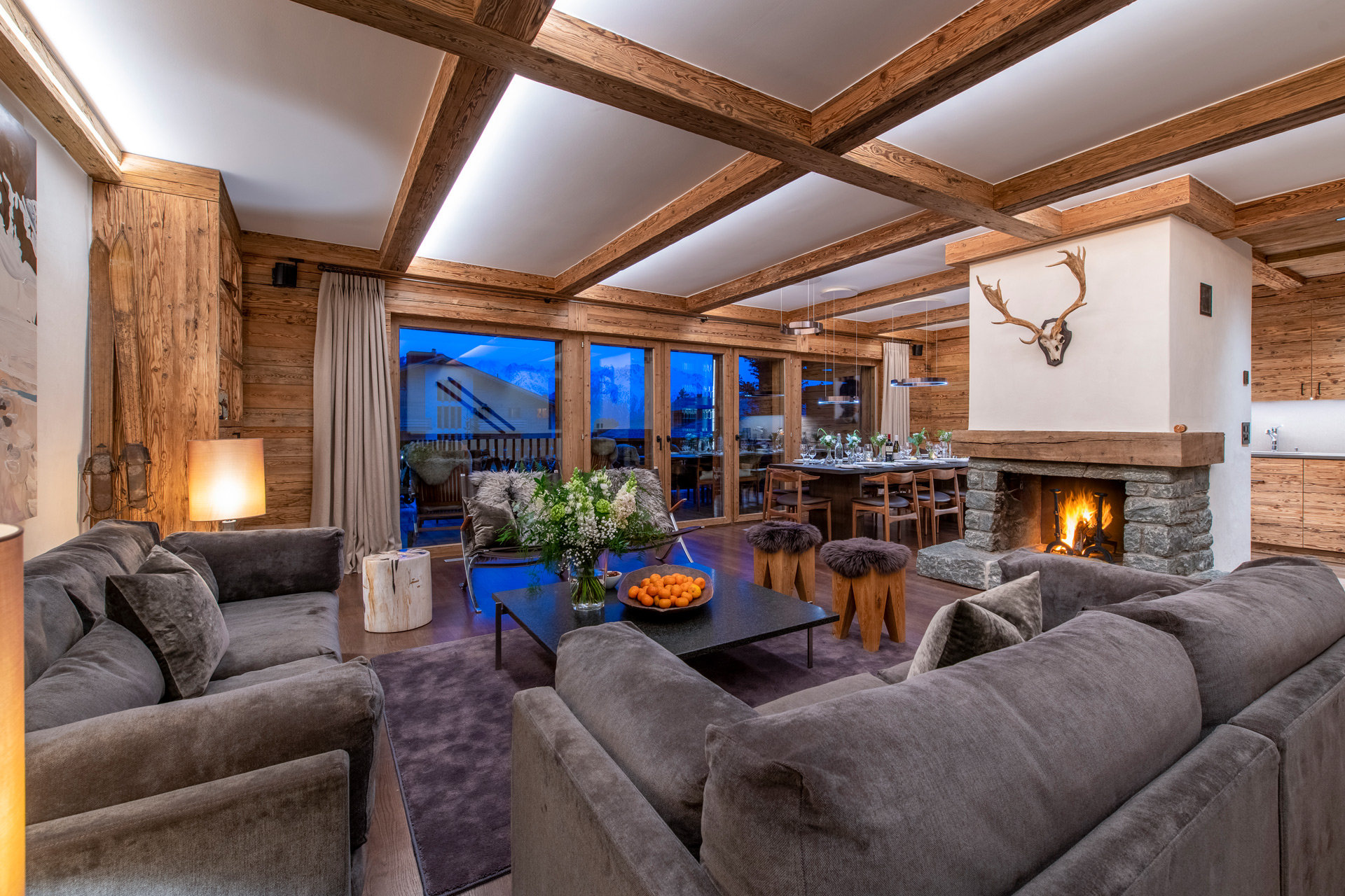 Sumptuous sofas and armchairs surround a flat screen TV and floor-to-ceiling French windows open onto a spacious terrace, furnished with fur-lined deck chairs for perfect post-ski relaxation. There is also a fully-equipped kitchen and Bose sound system throughout the apartment.