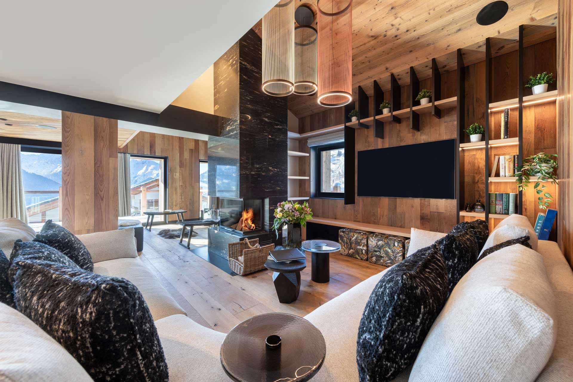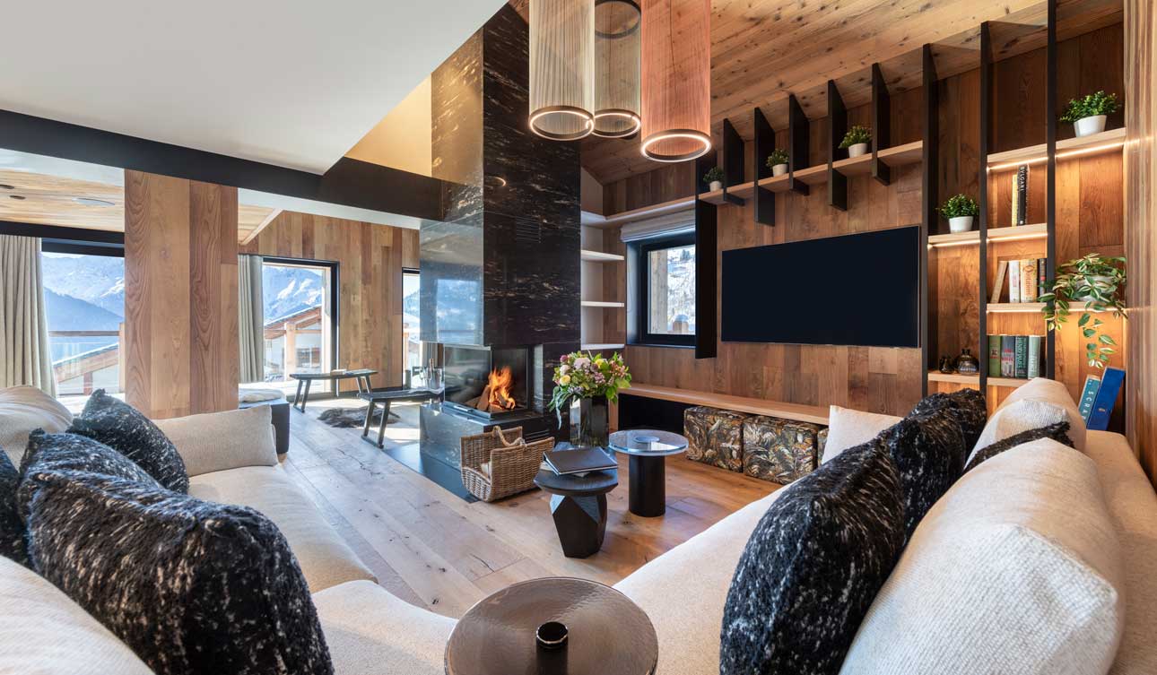 The open-plan living area features a corner sofa arranged around a feature fireplace and TV, offering the ideal spot to unwind after a day on the slopes. The bespoke kitchen flows seamlessly into the dining area, where sliding glass doors flood the space with natural light.