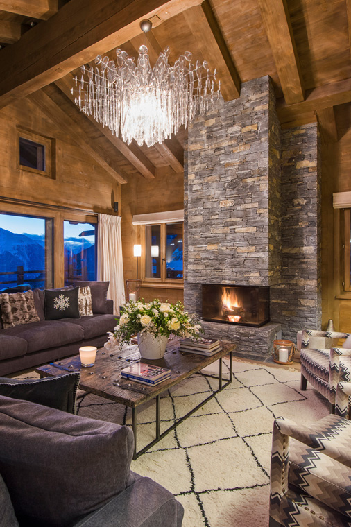 The main living area is open-plan with double-height ceilings and floor-to-ceiling French windows, which not only enhance the sense of light and space but open onto a terrace with uninterrupted views of the surrounding peaks.