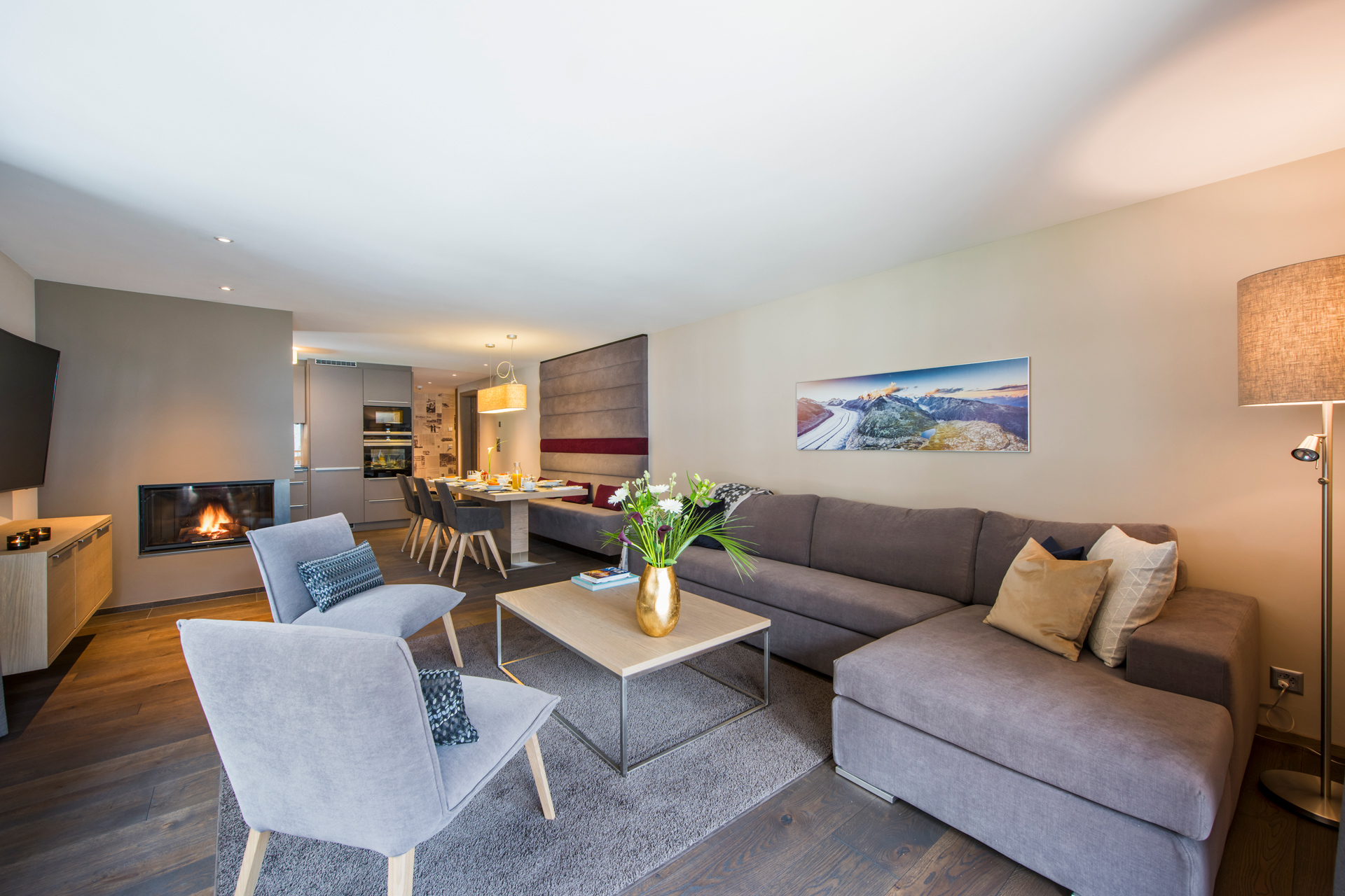 - The open-plan living area features a wood-burning fireplace, seating for eight, and floor-to-ceiling glass doors that open onto a south-facing terrace with views of the Matterhorn.
