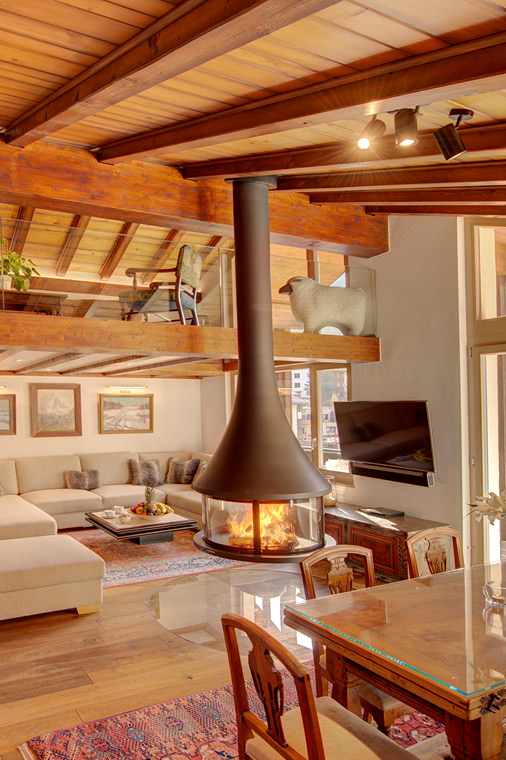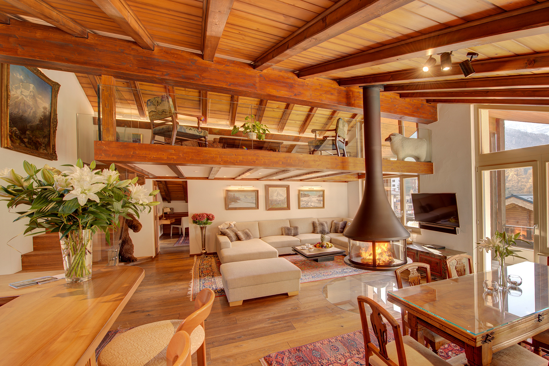 - The master bedroom is a real showstopper, with direct views of the Matterhorn from the bed and a Jacuzzi bathtub for post-ski relaxation.